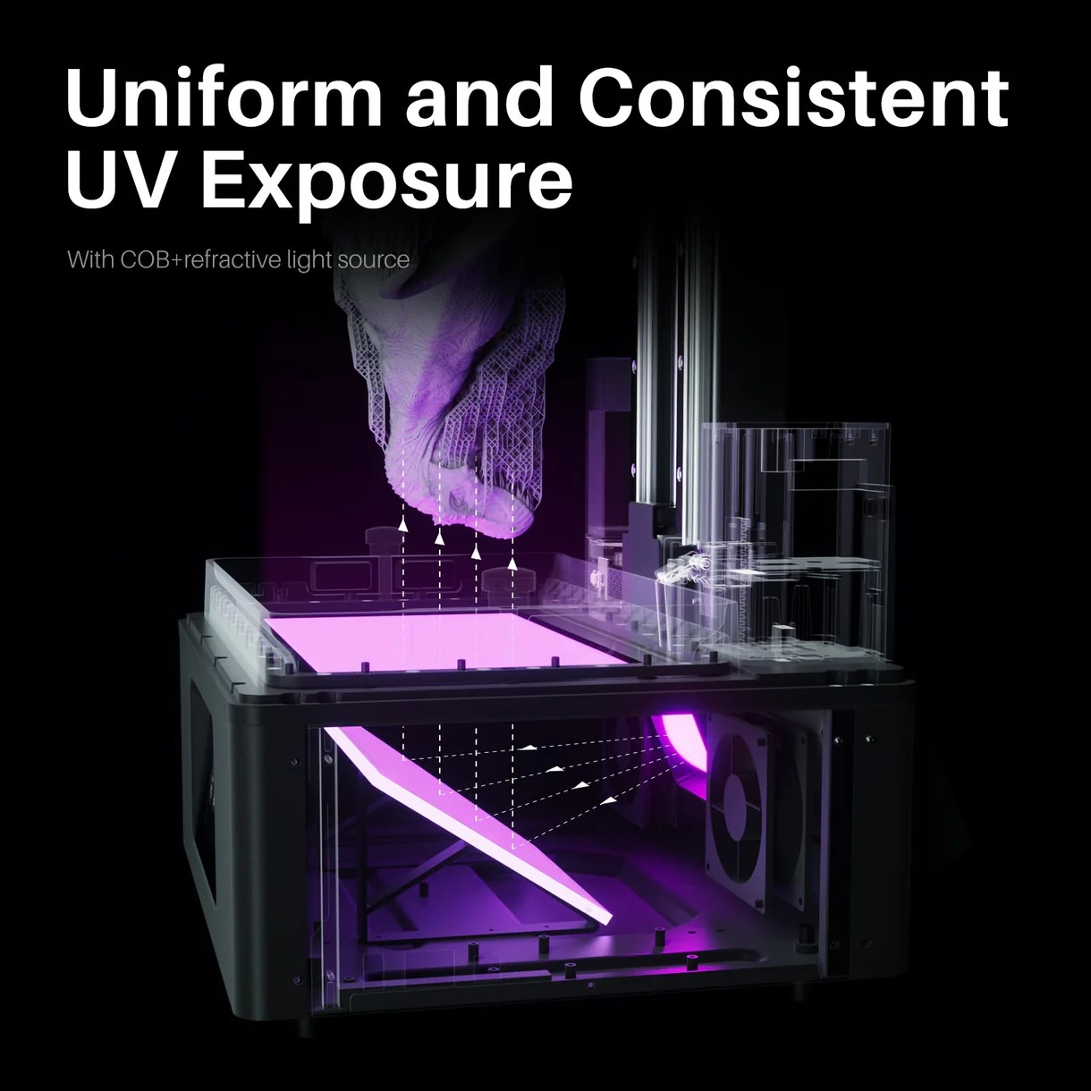 Ο εκτυπωτής χρησιμοποιεί πηγή φωτός COB σε συνδυασμό με διαθλαστική τεχνολογία, η οποία μειώνει τη διασπορά του φωτός και προσφέρει ομοιόμορφη και σταθερή έκθεση, με αποτέλεσμα πιο καθαρές λεπτομέρειες, πιο λείες τελικές εκτυπώσεις και ακριβείς διαστάσεις.