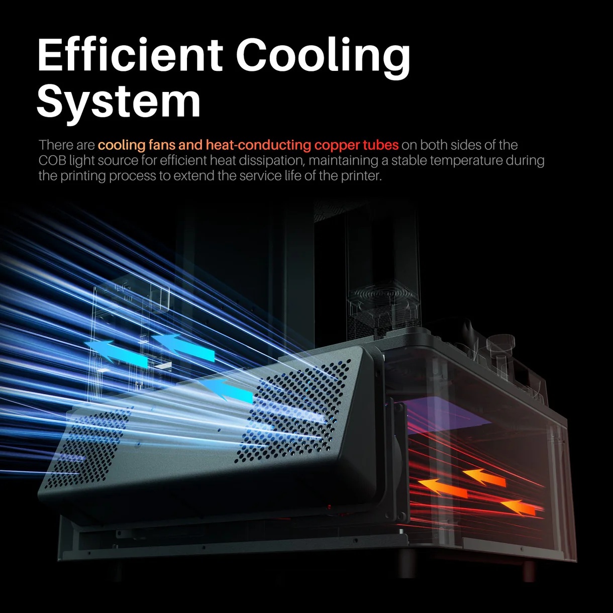 Υπάρχουν ανεμιστήρες ψύξης και χάλκινοι σωλήνες αγωγής θερμότητας και στις δύο πλευρές της πηγής φωτός COB, για αποτελεσματική απαγωγή θερμότητας. Αυτό διατηρεί σταθερή τη θερμοκρασία κατά τη διαδικασία εκτύπωσης και παρατείνει τη διάρκεια ζωής του εκτυπωτή.