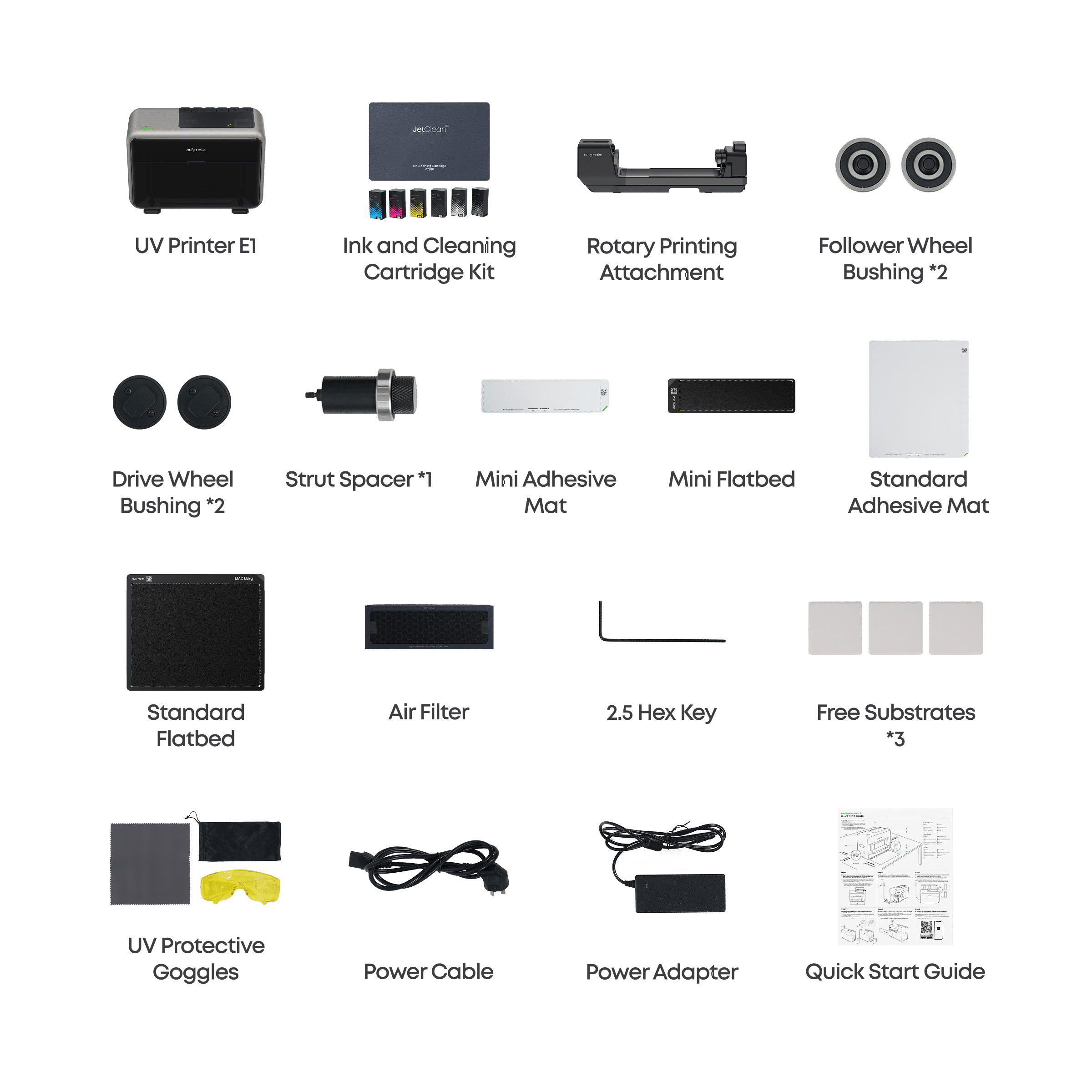 Είτε δημιουργείτε εξατομικευμένα προϊόντα είτε ξεκινάτε μια επιχείρηση εκτύπωσης κατά παραγγελία, το E1 προσφέρει την ευελιξία και την απόδοση που χρειάζεστε για να αναπτύξετε τις ιδέες σας. Παράλληλα, παραμένει κατάλληλο για οικιακή ή επαγγελματική χρήση, χάρη στο ενσωματωμένο σύστημα φιλτραρίσματος αέρα που μειώνει τις οσμές και τις πτητικές οργανικές ενώσεις (VOCs), καθώς και στο προστατευτικό UV κάλυμμα για ασφαλέστερη λειτουργία.