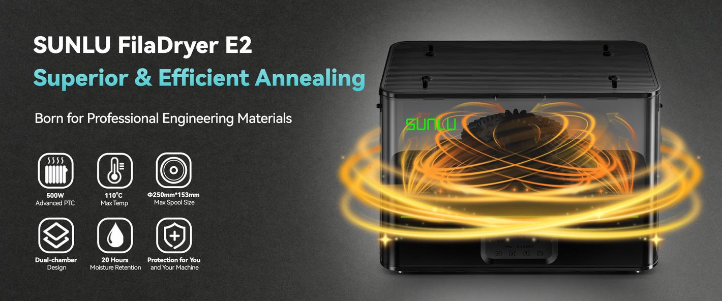 Το SUNLU FilaDryer E2 είναι μια συσκευή επαγγελματικών προδιαγραφών, σχεδιασμένη για στέγνωμα αλλά και ανόπτηση (annealing) νημάτων 3D εκτύπωσης και εκτυπωμένων εξαρτημάτων. Με μέγιστη θερμοκρασία 110°C, αφαιρεί αποτελεσματικά την υγρασία από υγροσκοπικά υλικά όπως νάιλον και πολυκαρβονικό, εξασφαλίζοντας βέλτιστη ποιότητα εκτύπωσης. Η λειτουργία ανόπτησης βελτιώνει τις μηχανικές ιδιότητες των εκτυπωμένων εξαρτημάτων, μειώνοντας τις εσωτερικές τάσεις, καθιστώντας το ιδανικό για εφαρμογές μηχανικής/engineering.