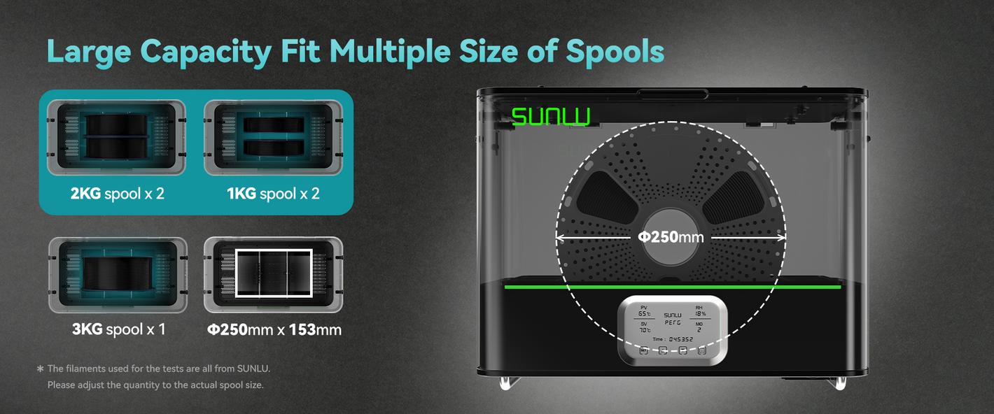 Σχεδιασμένο με ευρύχωρο θάλαμο, το FilaDryer E2 μπορεί να χωρέσει έως δύο καρούλια 1 kg ή ένα καρούλι 3 kg, καλύπτοντας διαφορετικά μεγέθη νημάτων. Η συμβατότητά του με διαμέτρους νήματος 1,75 mm και 2,85 mm το καθιστά ευέλικτο για διάφορα setup εκτύπωσης. Ο αεροστεγής και μονωμένος σχεδιασμός διατηρεί σταθερές εσωτερικές θερμοκρασίες και αποτρέπει την είσοδο υγρασίας, διασφαλίζοντας ότι τα νήματα παραμένουν σε άριστη κατάσταση.